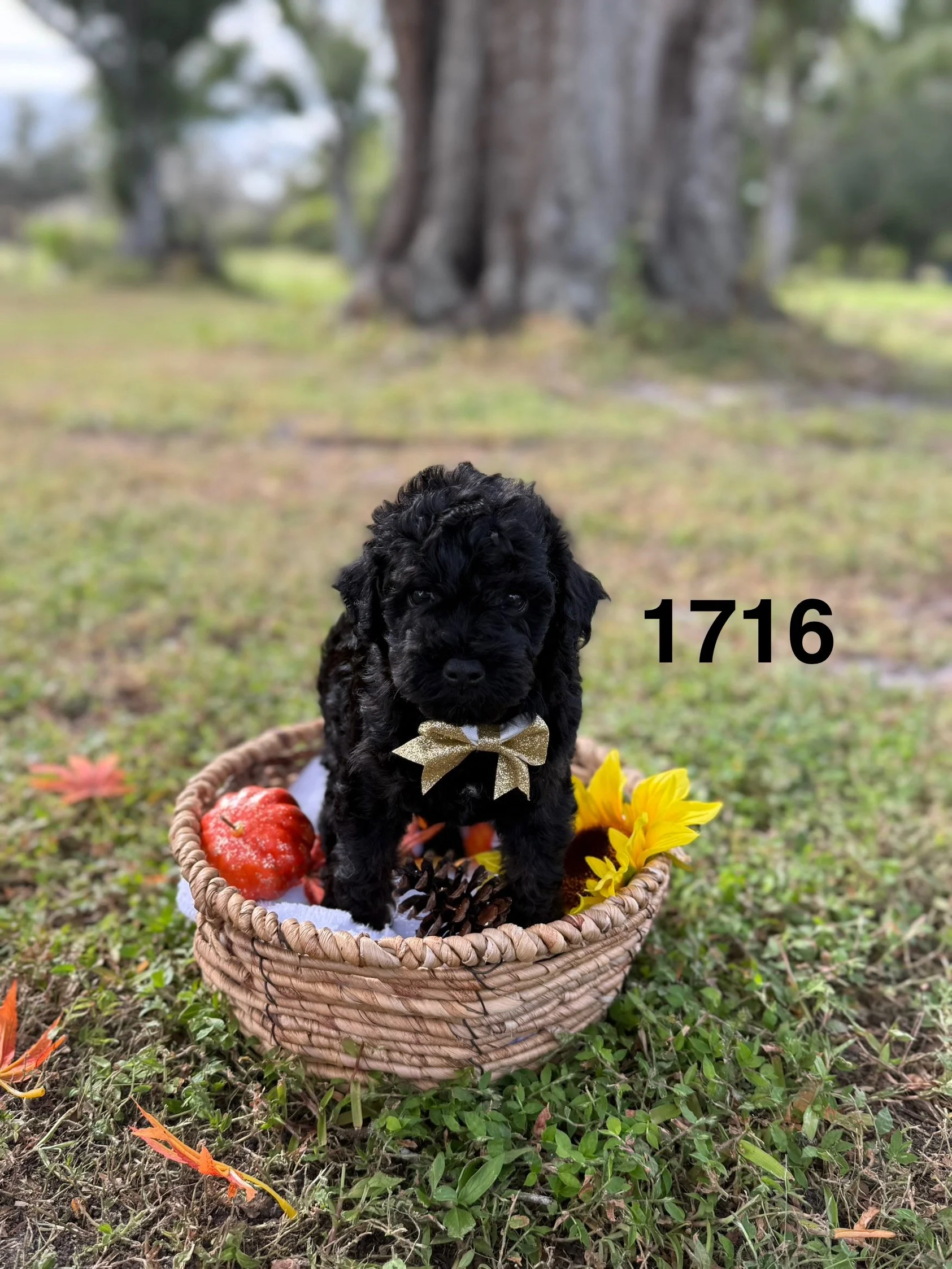 Phoebe and Chance's little boy is a black Goldendoodle with a curly, non-shedding coat. He embodies the best qualities of both parents, offering a friendly temperament and low-allergen fur, ideal for families seeking a loving and hypoallergenic companion.