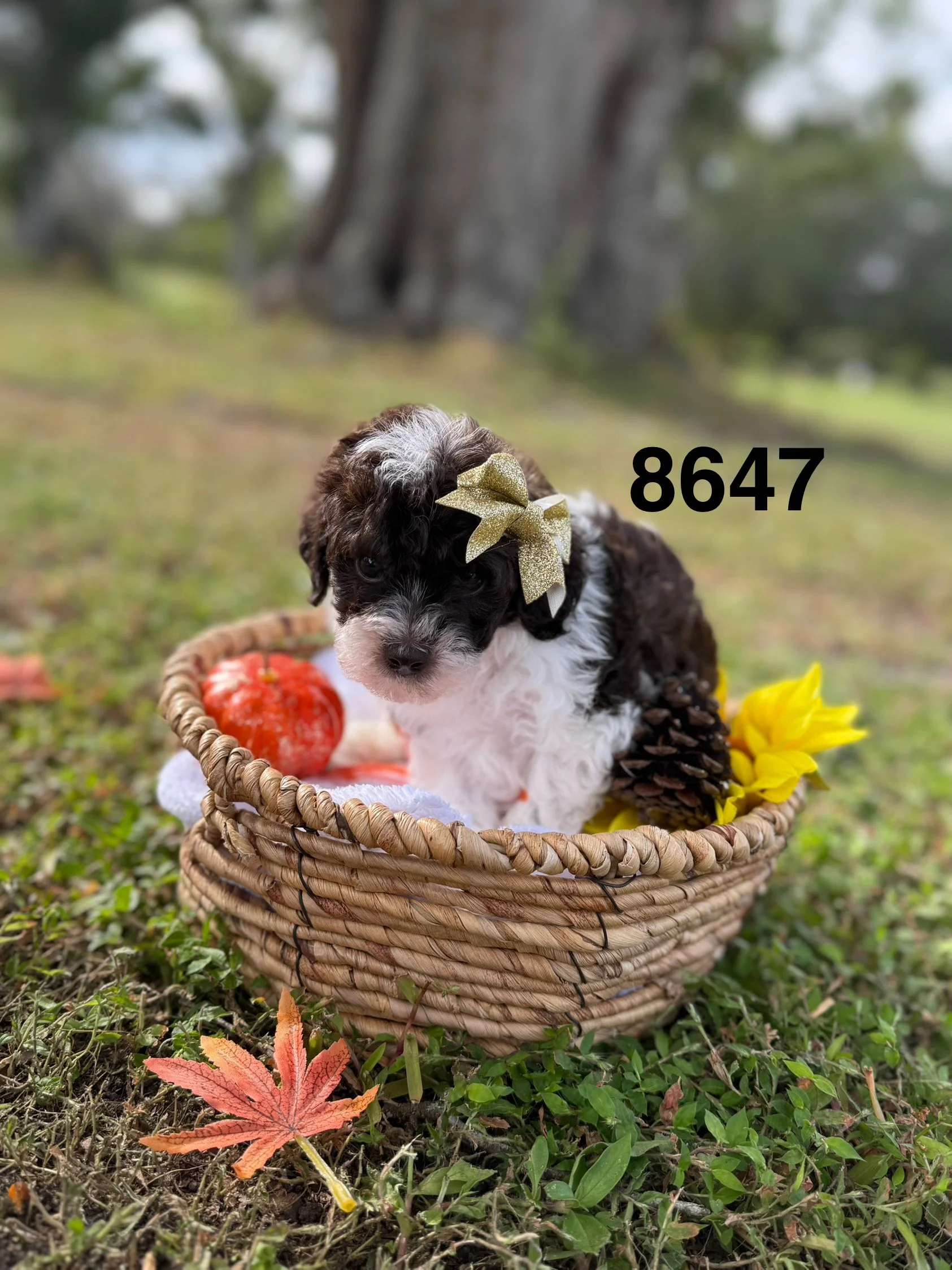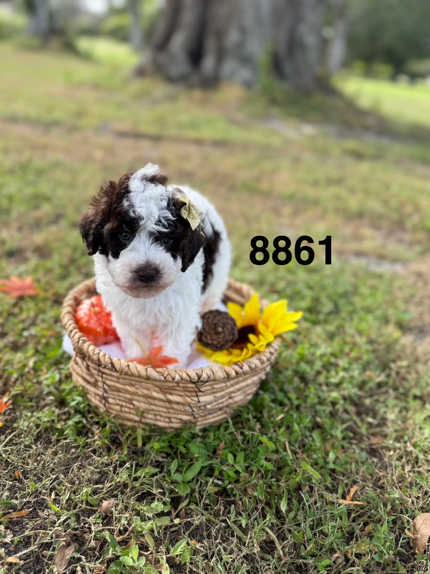 Phoebe and Chance's little girl is a beautiful Chocolate and White Parti. She has a curly, non-shedding coat, making her a perfect companion for those seeking a hypoallergenic pet. Her unique coloring and soft curls highlight her charming and playful personality.