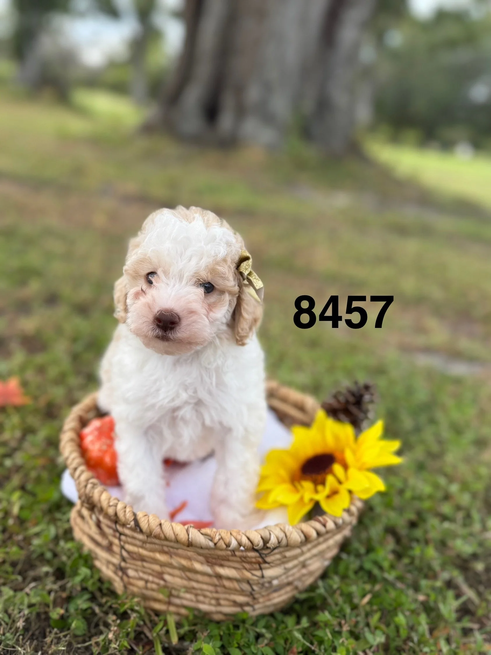 Pheobe and Chance's little girl is a beautiful Tan and White Parti with a curly, non-shedding coat. Her coat texture makes her an excellent choice for families seeking a hypoallergenic pet. She combines the charming coloring of her Parti pattern with the gentle, playful temperament characteristic of Goldendoodles.