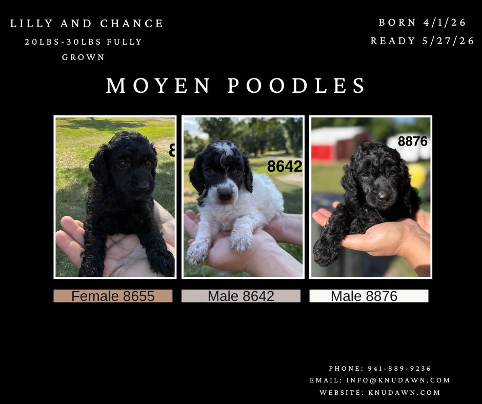We’re excited to share that our Moyen Poodle litter is growing into sweet, well-socialized companions. At this stage they’re showing great temperaments, good body confirmations for the Moyen size, and strong curiosity — perfect for families, singles, or active homes looking for a loving, medium-sized doodle.