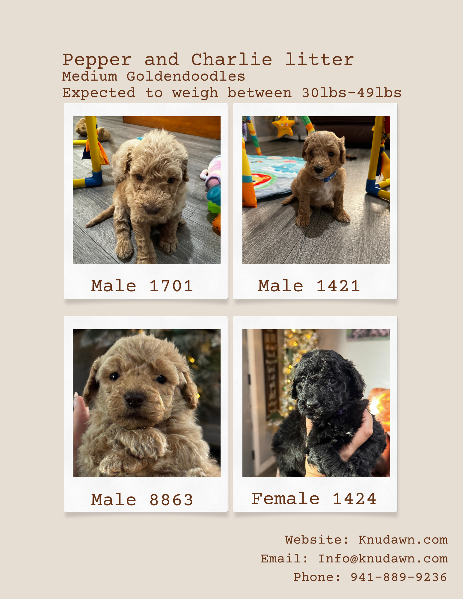 Our Pepper and Charlie Medium Goldendoodle litter will be ready for their forever homes around January 19th. Four puppies remain: 1 black female and 3 apricot males. Their personalities are blossoming, and they’re enjoying outdoor playtime now. These puppies are expected to reach 30–49 lbs and have the curly, hypoallergenic coat. You can see more information about their parents on our website, knudawn.com .