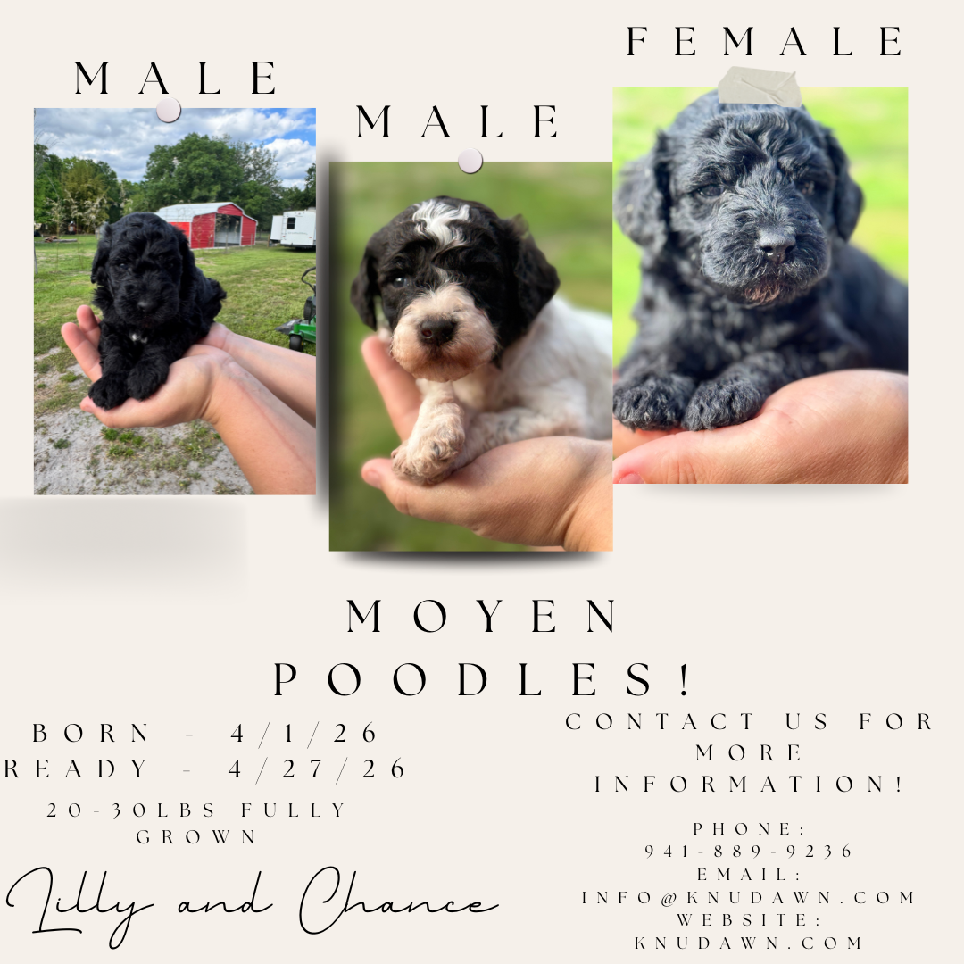 Hey there everyone! We have a specialty litter this time — beautiful Moyen Poodle puppies! These sweet pups are expected to be between 20–30 lbs fully grown. There are 2 males and 1 female available.